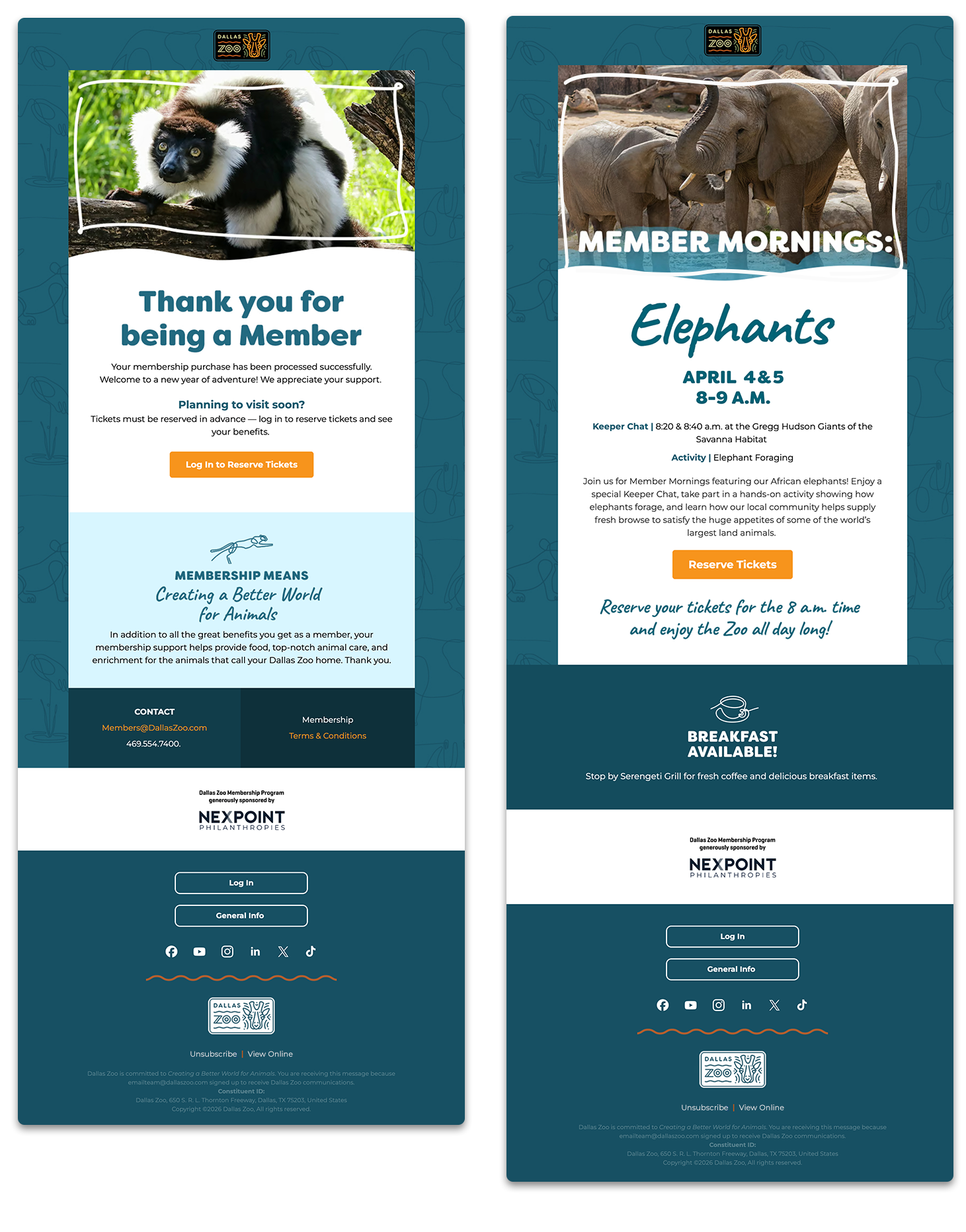 Dallas Zoo memberships are a major driver of annual revenue and a central part of the Zoo’s culture. Because member communication happens primarily in digital channels, I created a cohesive digital style system to support consistent, engaging touchpoints on a regular basis.